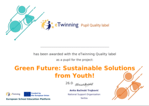 Национална ознака квалитета eTwininng пројекта Green Future: Sustainable Solutions from Youth! за школску 2024/25. годину.